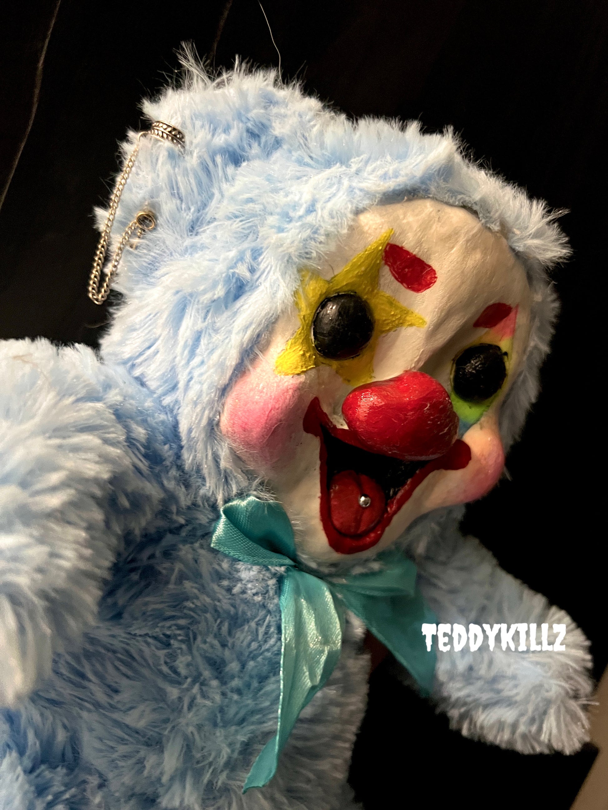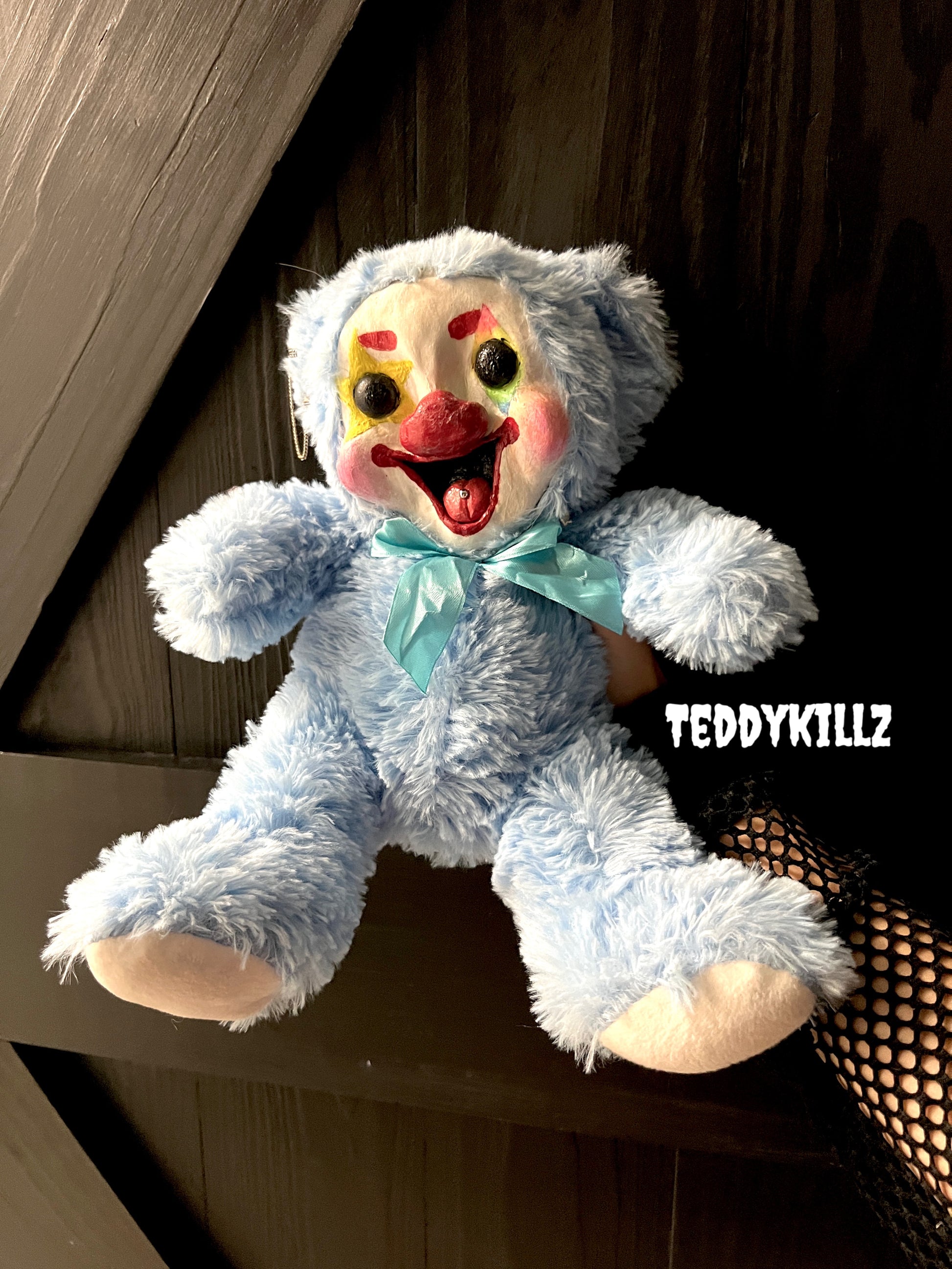 Introducing "CHASING CLOWN," the perfect addition to your creepy collection. This teddy bear is dressed as a sinister clown, bringing a touch of eerie charm to any room. Expertly crafted with attention to detail, this plush toy is sure to make a statement and give you a thrill.