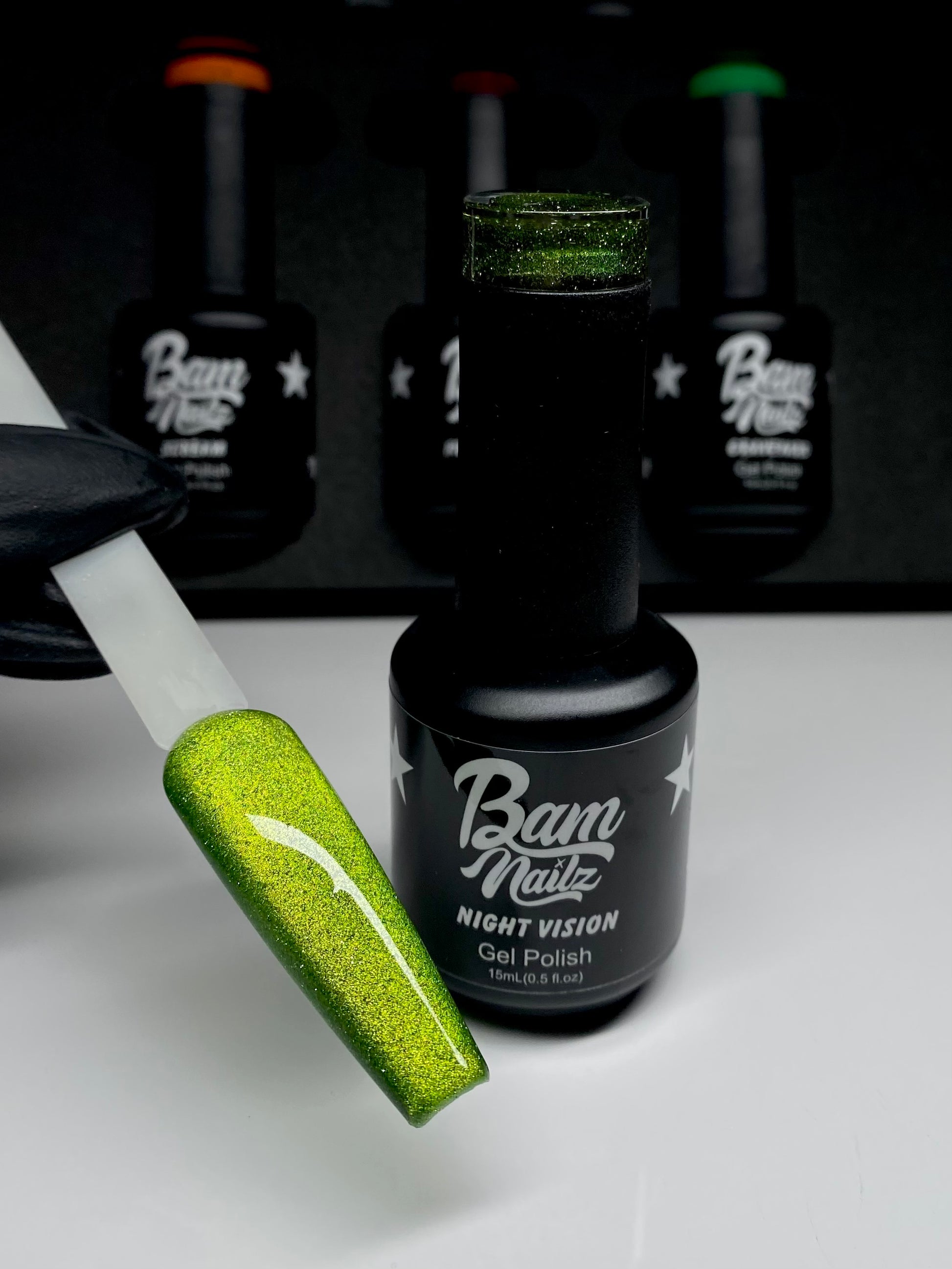 Enhance your Halloween look with "NIGHT VISION" CatEye Gel. This 15ml polish features a vibrant, cat eye green color that will make your nails stand out. With its night vision effect, your nails will look bold and spooky, perfect for the Halloween season.