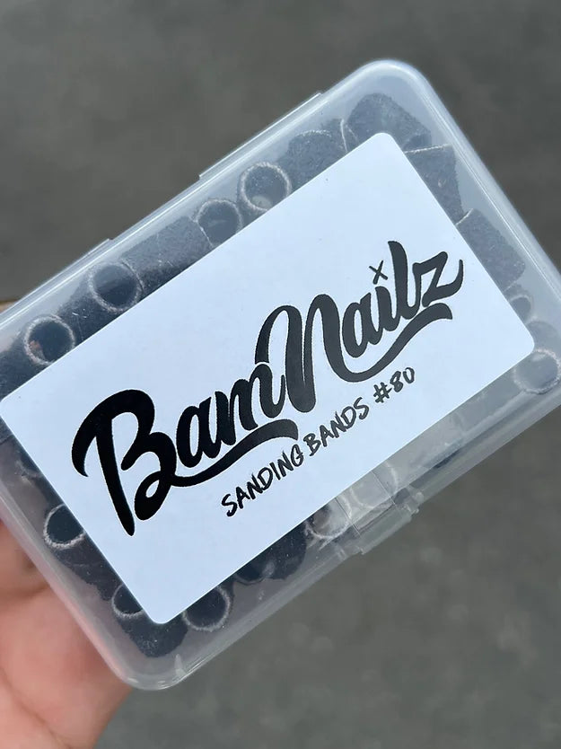 "SANDING BANDS" x100 - This box is loaded with 100 Sanding Bands, perfect for acrylics or filing other materials. Prepare your natural nails with ease using #180 grit. Get ready for a flawless finish every time!